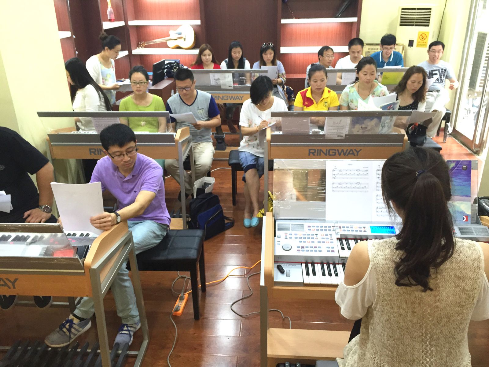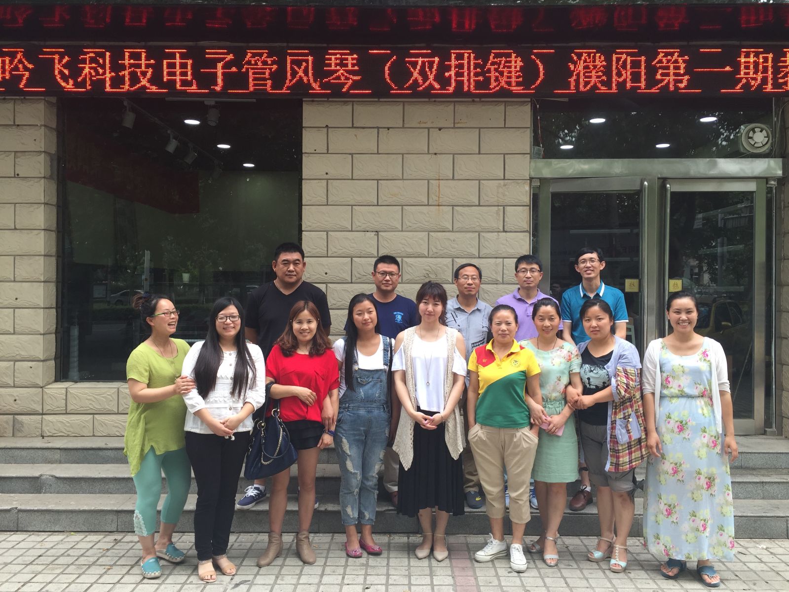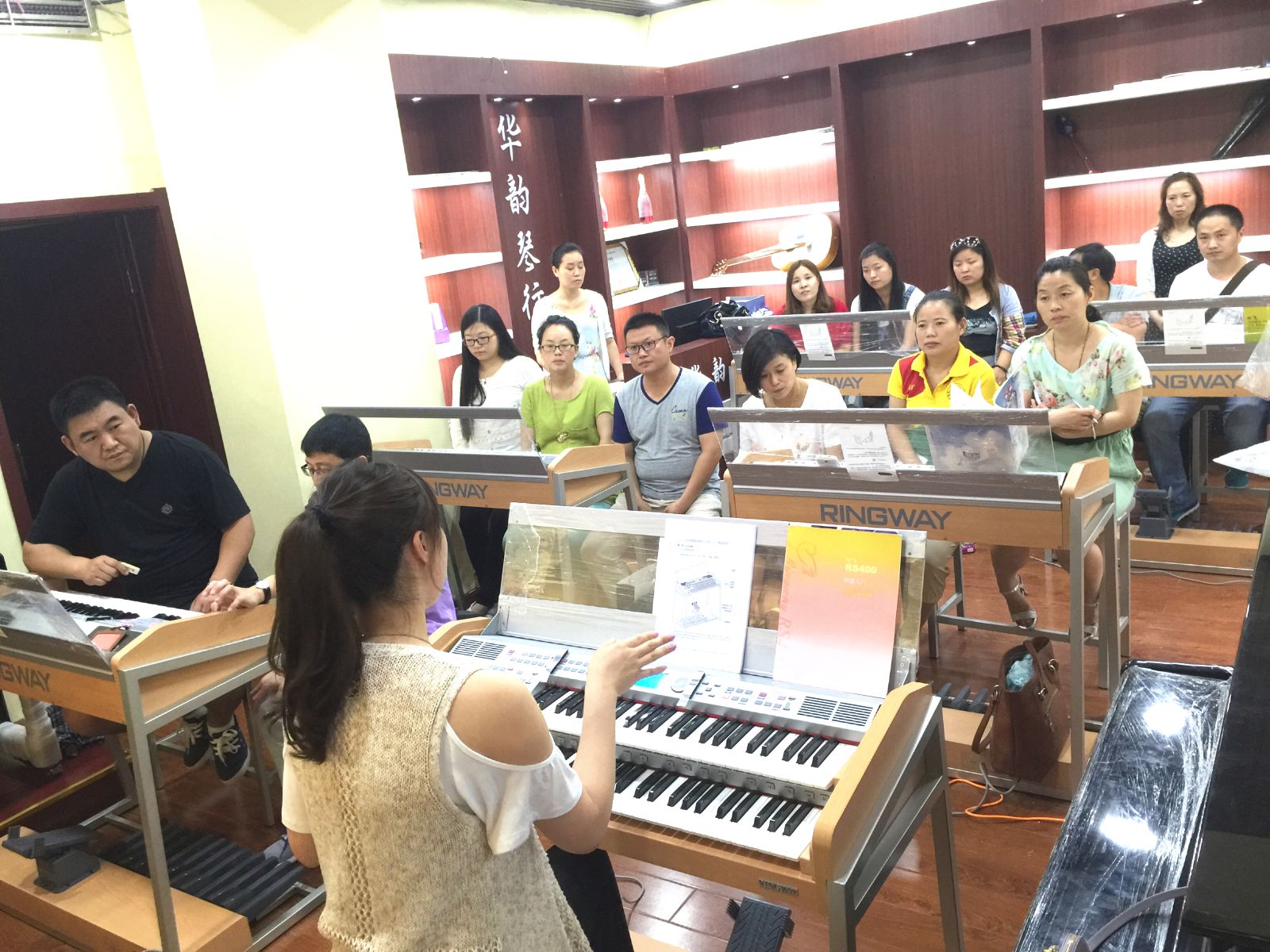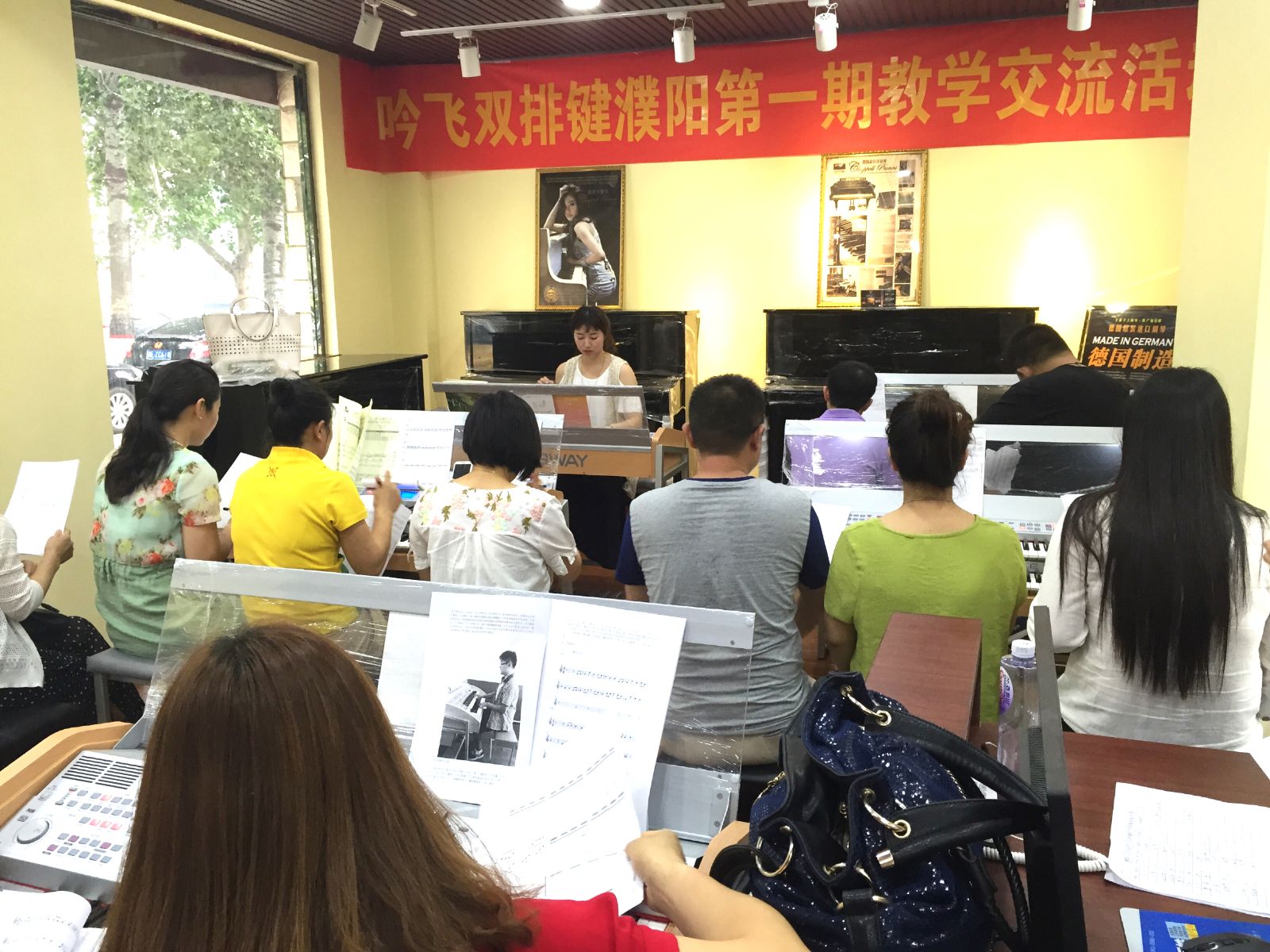 2015年6月15-16日來自河南省濮陽市十五位鍵盤老師在濮陽市華韻琴行參加了由吟飛科技(江蘇)有限公司和銀河琴行、華韻琴行共同舉辦的“吟飛科技電子管風琴(雙排鍵)濮陽市第一期教學交流活動”。本次活動由畢業(yè)于上海音樂學院雙排鍵專業(yè)、現(xiàn)為吟飛藝術(shù)中心音樂執(zhí)行闖璐主講,闖璐老師詳細講解了吟飛RS400電子管風琴(雙排鍵)的面板功能操作,上、下鍵盤的演奏技巧,腳鍵盤和上下鍵盤的配合應(yīng)用,USB的功能的操作和實際應(yīng)用,并回答了與會老師提出的雙排鍵操作、教學等一系列問題,使參加活動的鍵盤老師們對“吟飛”電子管風琴(雙排鍵)有了更深入、細致的了解,與會的老師們對電子管風琴(雙排鍵)的普及教育和未來的發(fā)展有了進一步的共識。根據(jù)與會老師的要求,我司有計劃在今年和銀河琴行合作開展長期的電子管風琴(雙排鍵)師資培訓工作。