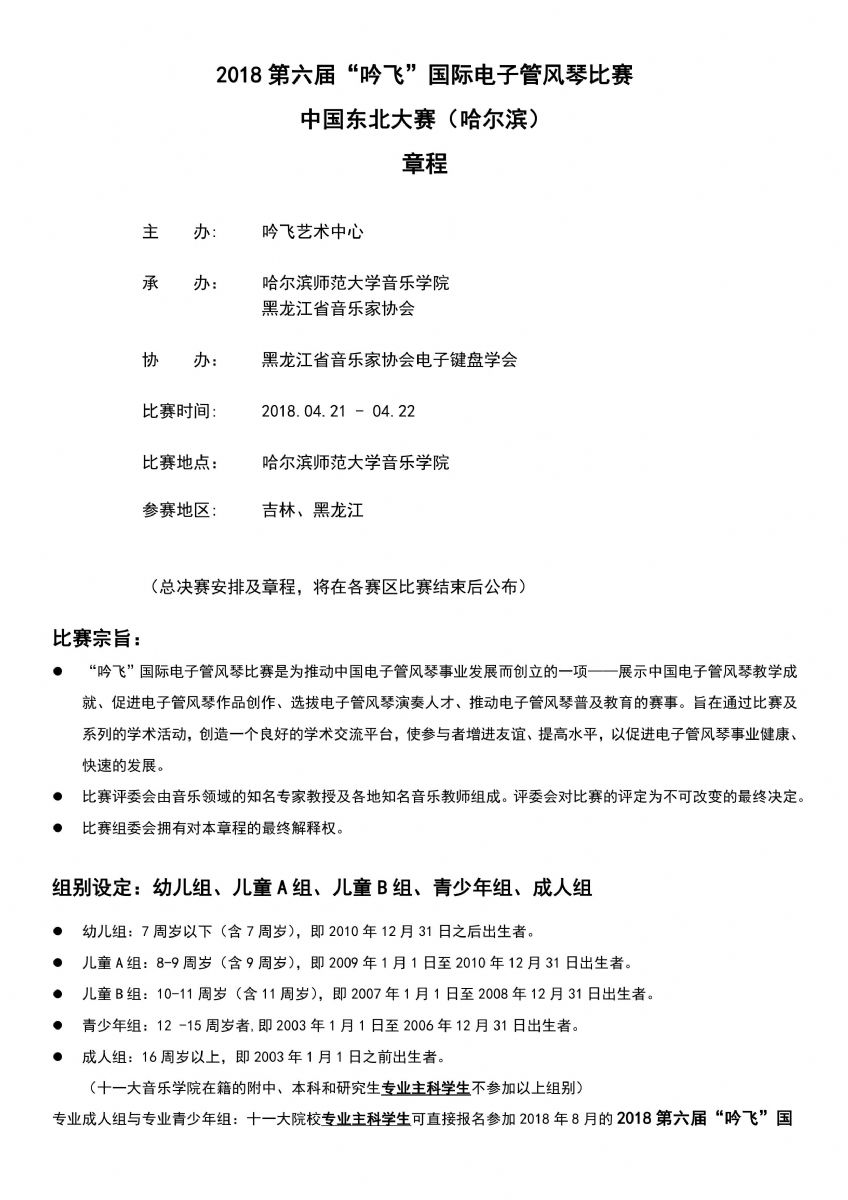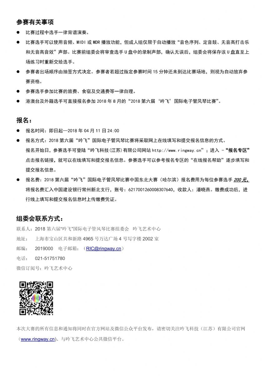 2018第六屆“吟飛”國際電子管風琴比賽中國東北大賽(哈爾濱)賽區(qū)參賽指南和詳細賽程稍后也將發(fā)布,請隨時關注“吟飛科技(江蘇)有限公司官網(wǎng)xiaomuwl.cn”和“吟飛藝術中心”微信公眾號。