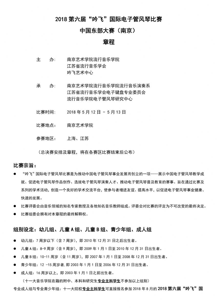 2018第六屆“吟飛”國際電子管風(fēng)琴比賽中國東部大賽(南京)賽區(qū)報名通道已經(jīng)開啟,將于4月30日關(guān)閉,請各位要報名的選手不要錯過啦~