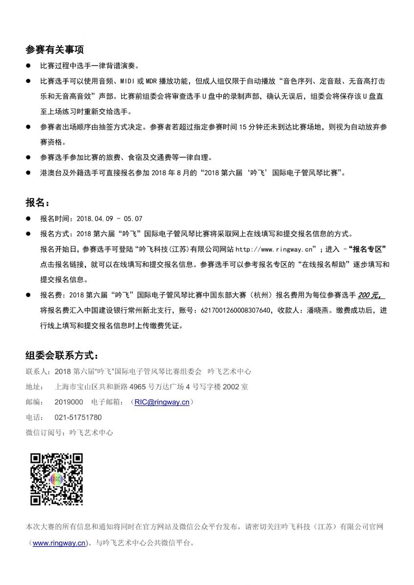 2018第六屆“吟飛”國際電子管風(fēng)琴比賽中國東部大賽(杭州)賽區(qū)參賽指南和詳細(xì)賽程稍后也將發(fā)布,請(qǐng)隨時(shí)關(guān)注“吟飛科技(江蘇)有限公司官網(wǎng)xiaomuwl.cn”和“吟飛藝術(shù)中心”微信公眾號(hào)。