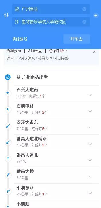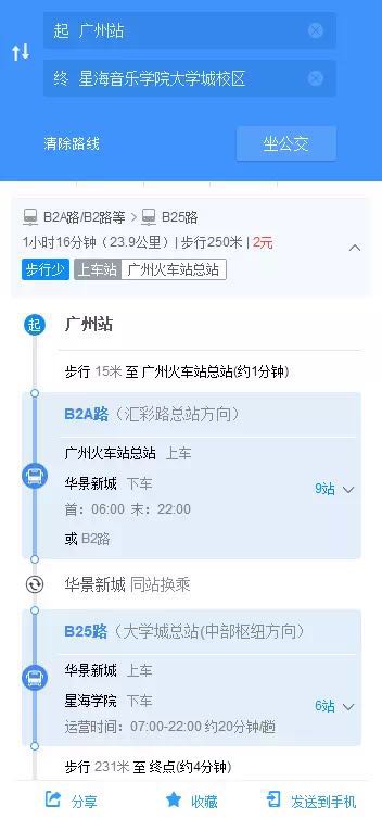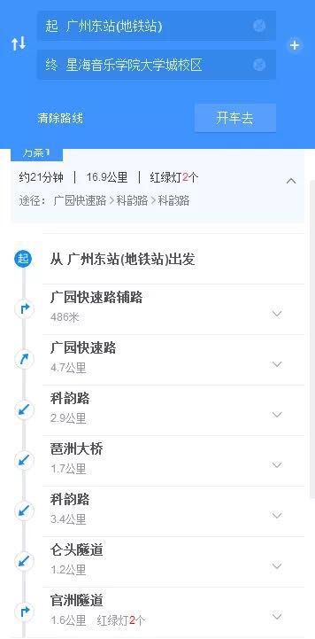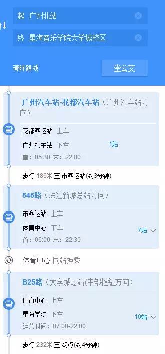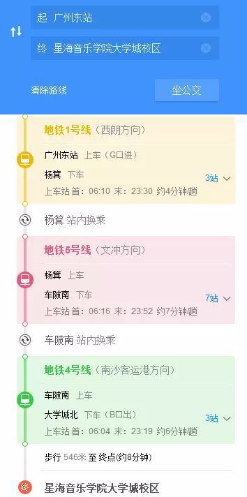 站前路→建設(shè)路→農(nóng)新路→G4W2許廣高速→G15沈海高速→S4華南快速→小洲東路→小洲路→大學(xué)城外環(huán)西路→星海音樂學(xué)院大學(xué)城校區(qū)