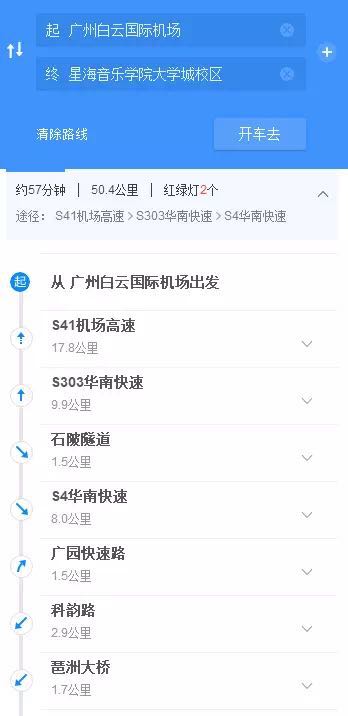 S41機(jī)場高速→S303華南快速→石陂隧道→S4華南快速→小洲東路→小洲路→大學(xué)城外環(huán)西路→星海音樂學(xué)院大學(xué)城校區(qū)