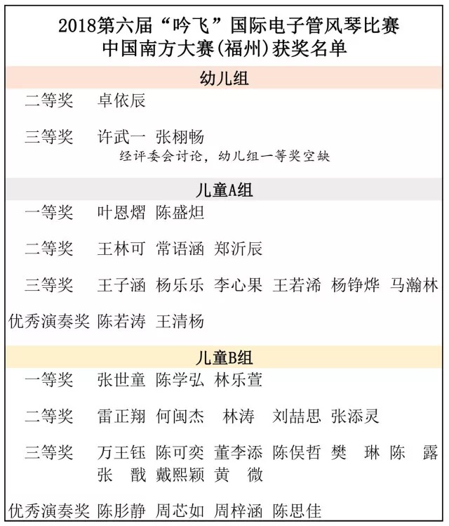 【獲獎名單·福州】2018第六屆“吟飛”國際電子管風(fēng)琴比賽