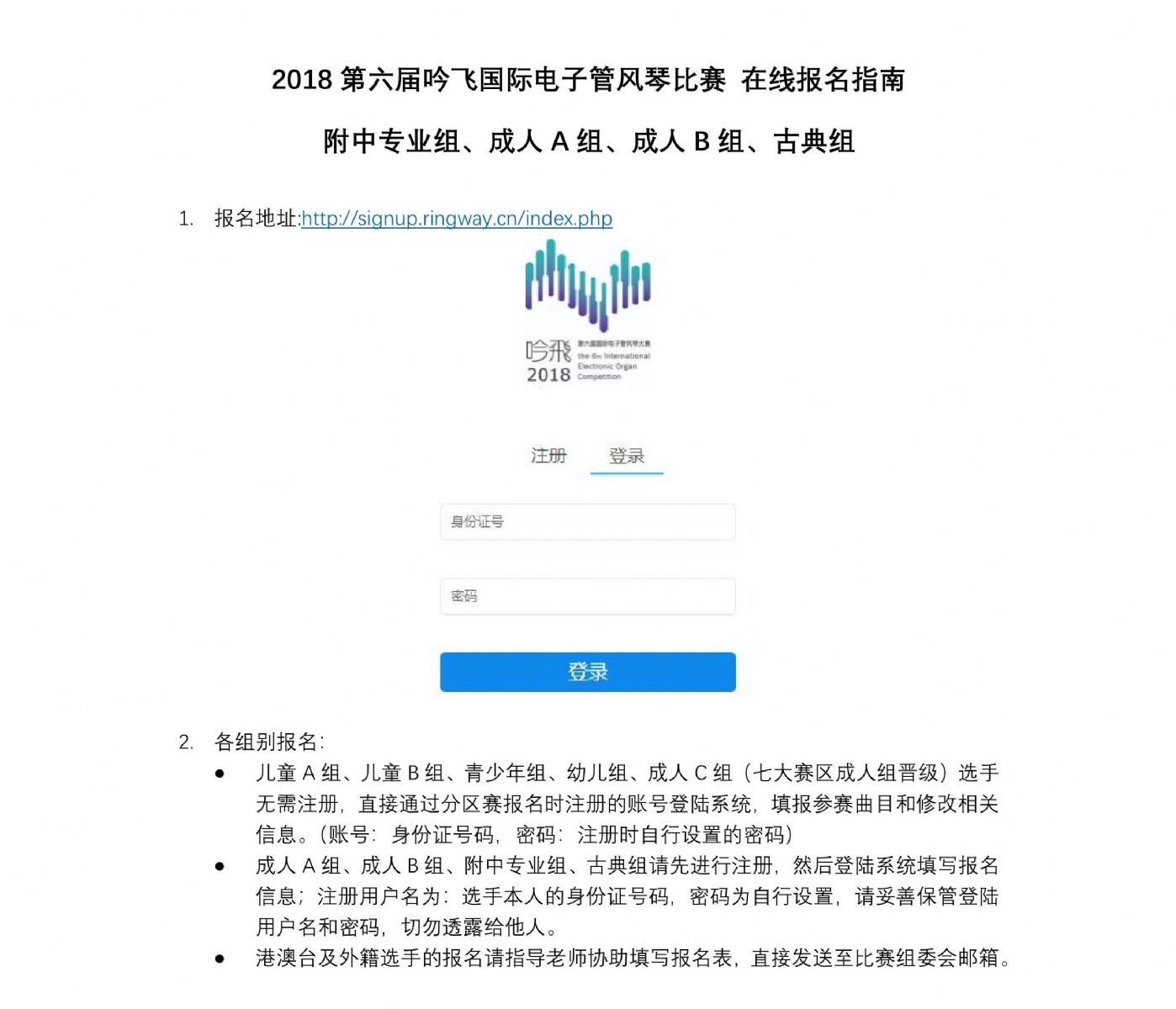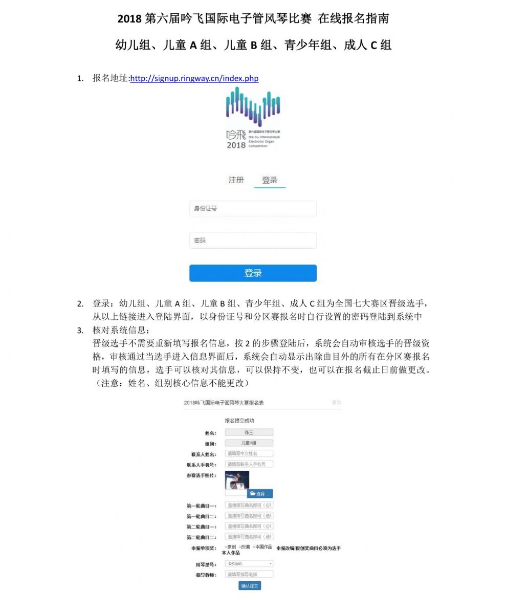 2018第六屆“吟飛”國際電子管方琴比賽總結賽將于6月15日—6月22日報名,請參加比賽的選手盡快報名,此次報名依舊采取網(wǎng)上在線報名,專業(yè)組和分賽區(qū)晉級選手可在報名專區(qū)進行報名,港澳臺及海外選手下載報名表(見附件)并提交至RIC@ringway.cn進行報名。